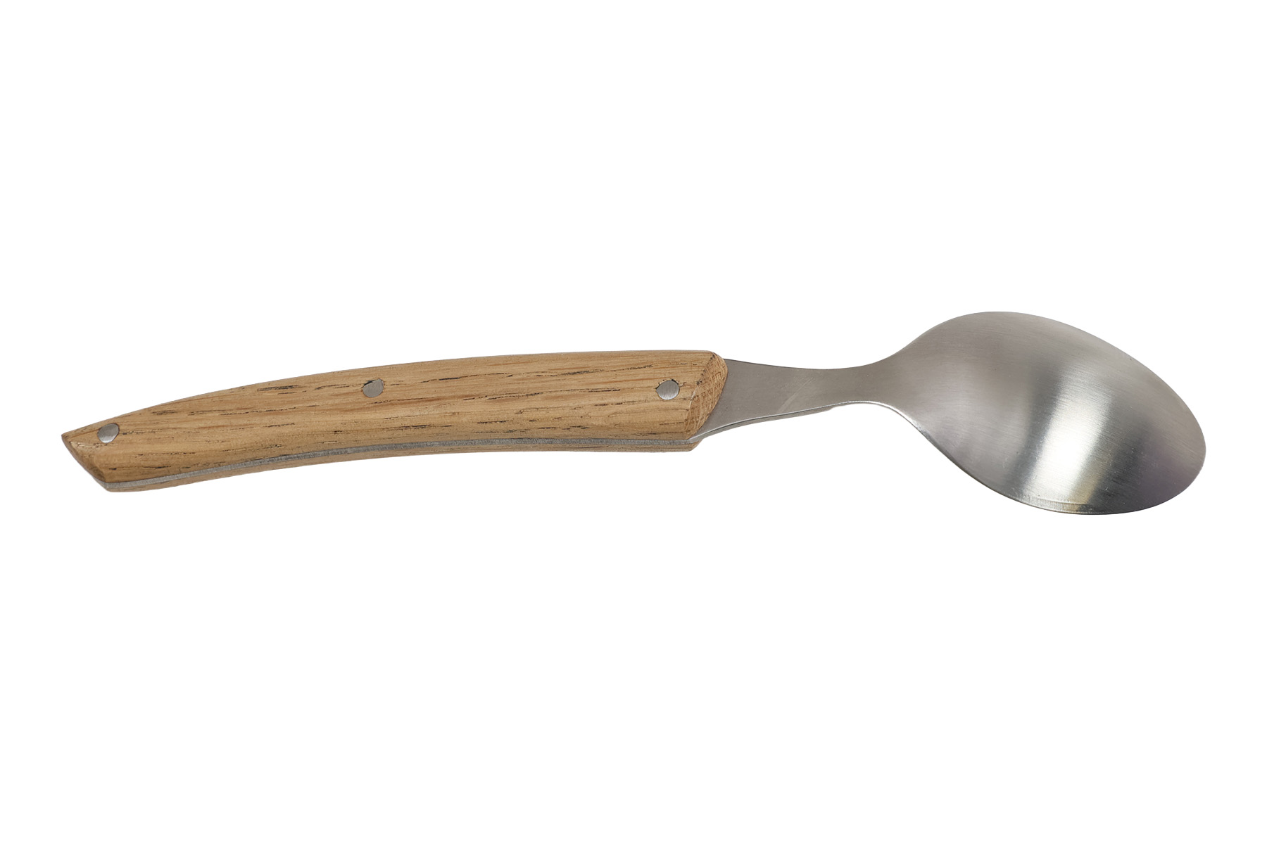 Cuillère réalisée en inox montée sur un manche en chêne.