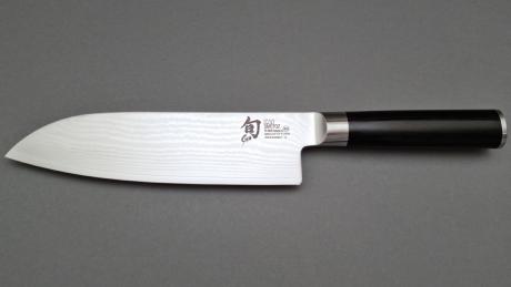 Ce couteau de cuisine japonais santoku Kai Shun Classic ainsi que cette planche à découper sont livrés en coffret.