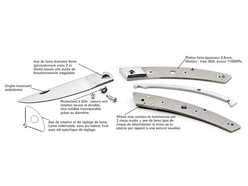 Sa forme imposée, sa lame de qualité en acier inoxydable X50CrMoV15, son manche en matière noble ou en essences prisées (noyer, olivier vallernia, corne...) en font un couteau apprécié de tous.