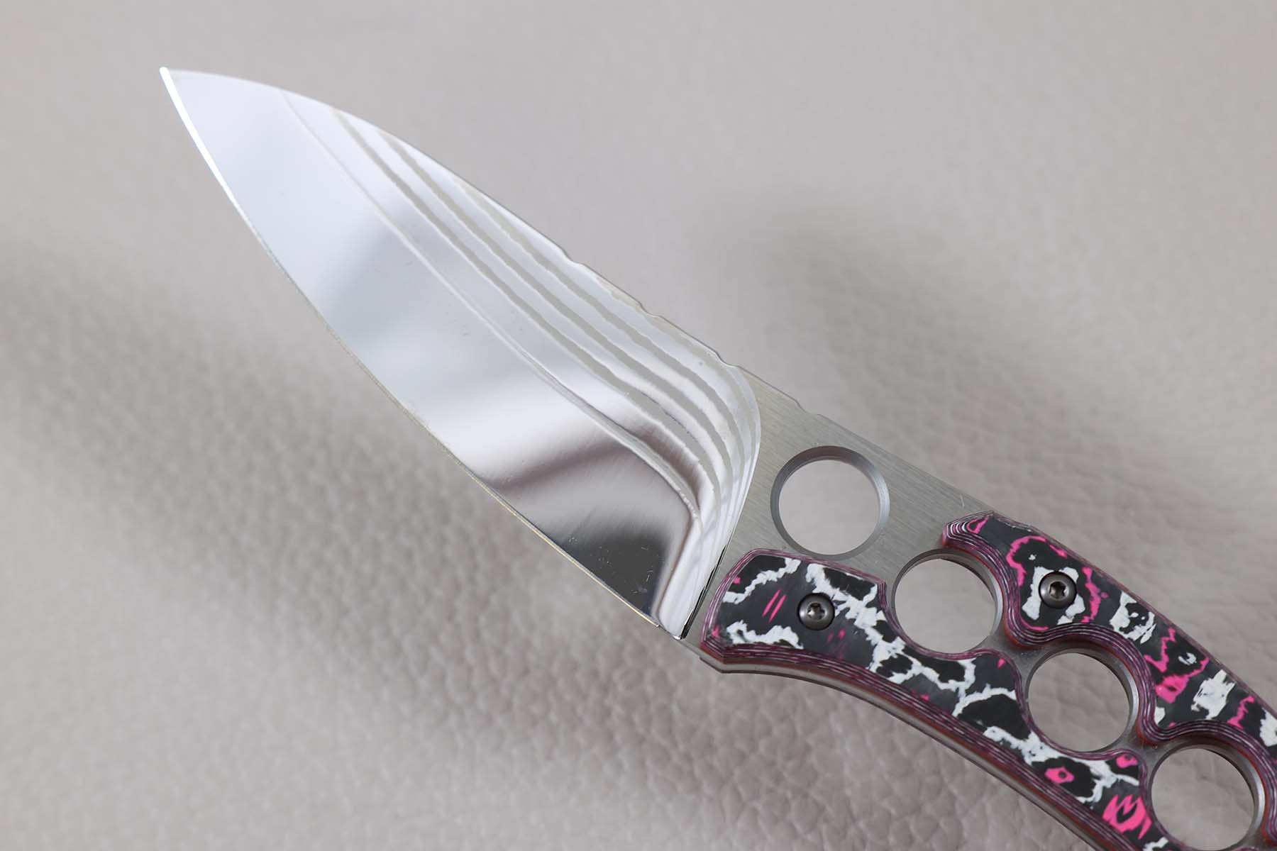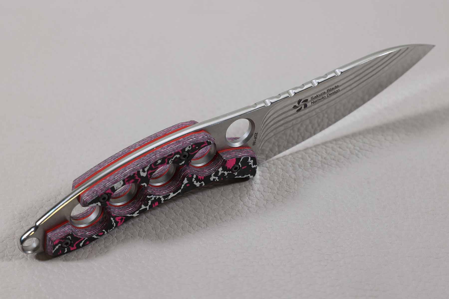 Ce couteau est réalisé avec un manche en fibre de carbone colorée rose.