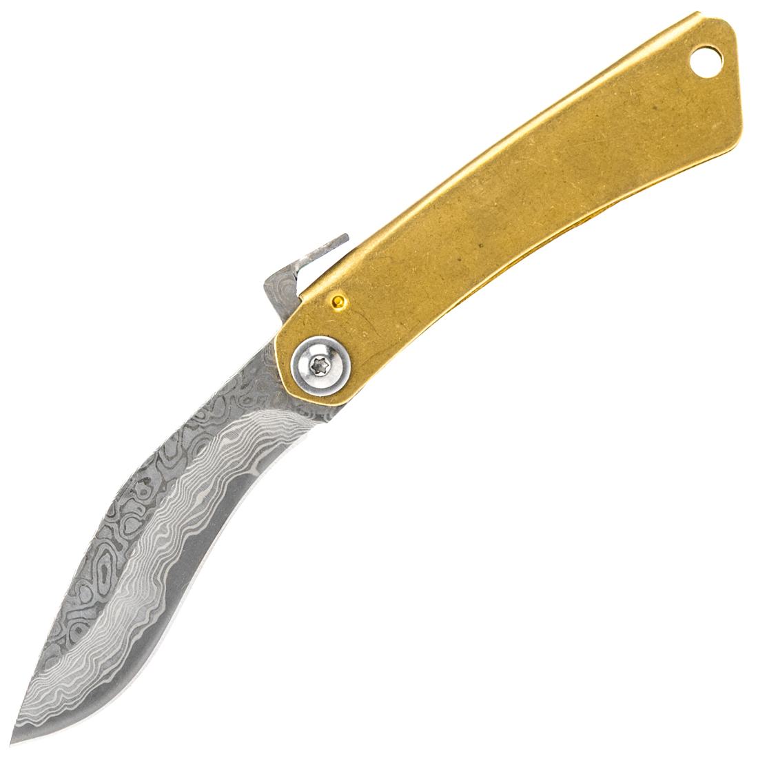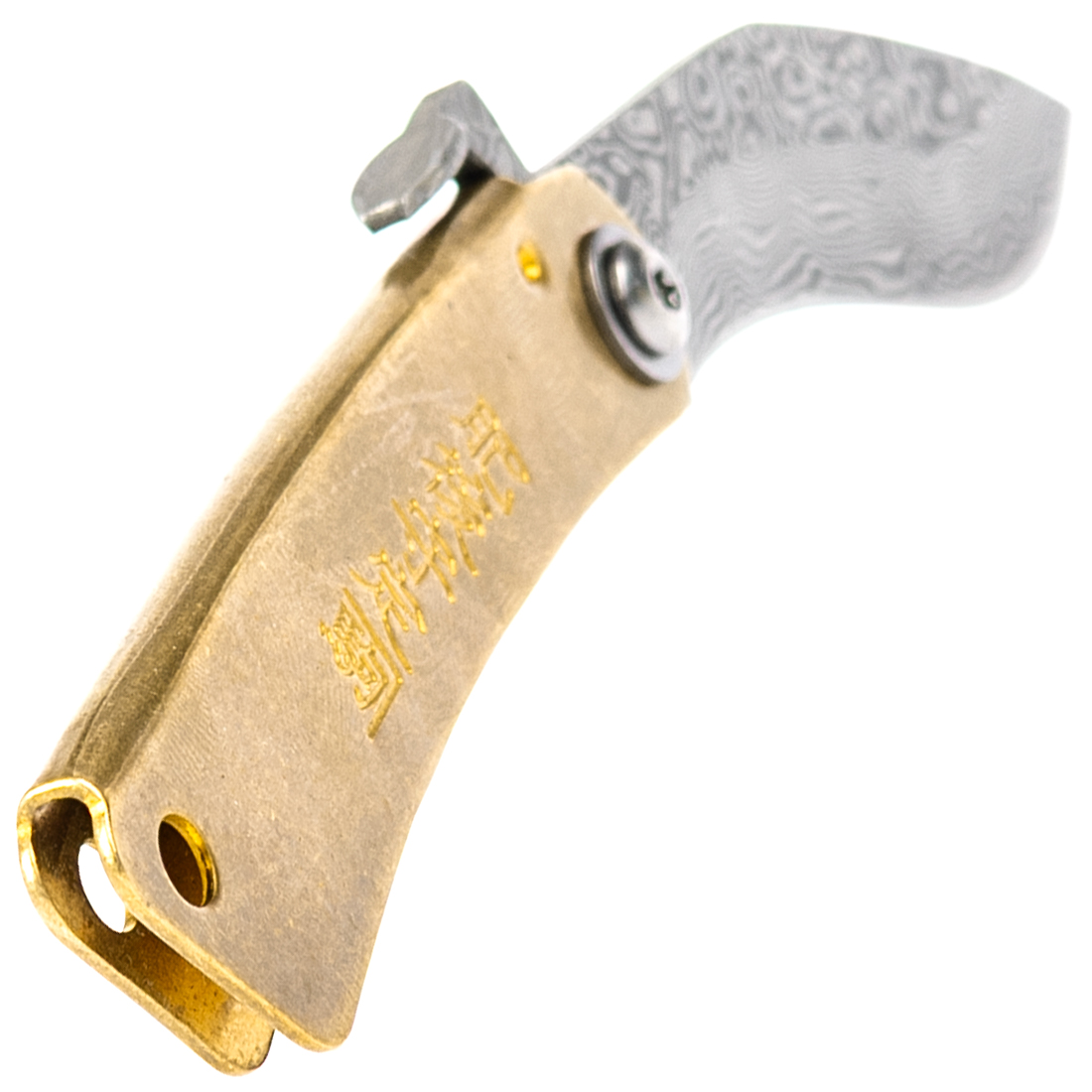 Ce couteau est muni d'une lame en acier San Maï Damas, montée sur un manche en laiton.