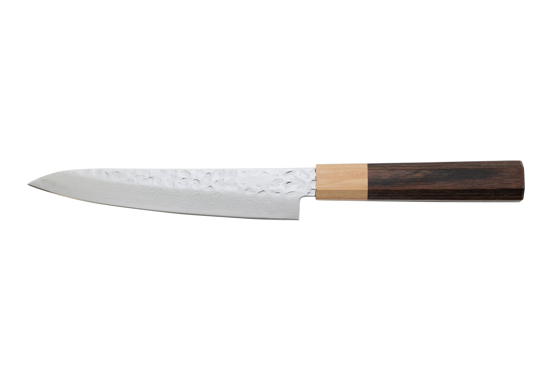 Lame martelée en acier inoxydable VG10 damas (61±1HRC), finition poli miroir.