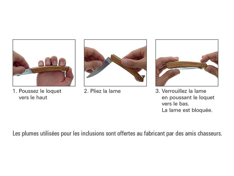 Sa forme imposée, sa lame de qualité en acier inoxydable X50CrMoV15, son manche en matière noble ou en essences prisées (noyer, olivier vallernia, corne...) en font un couteau apprécié de tous.