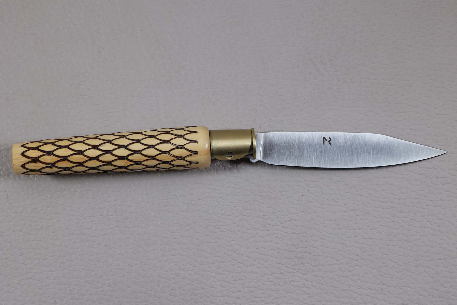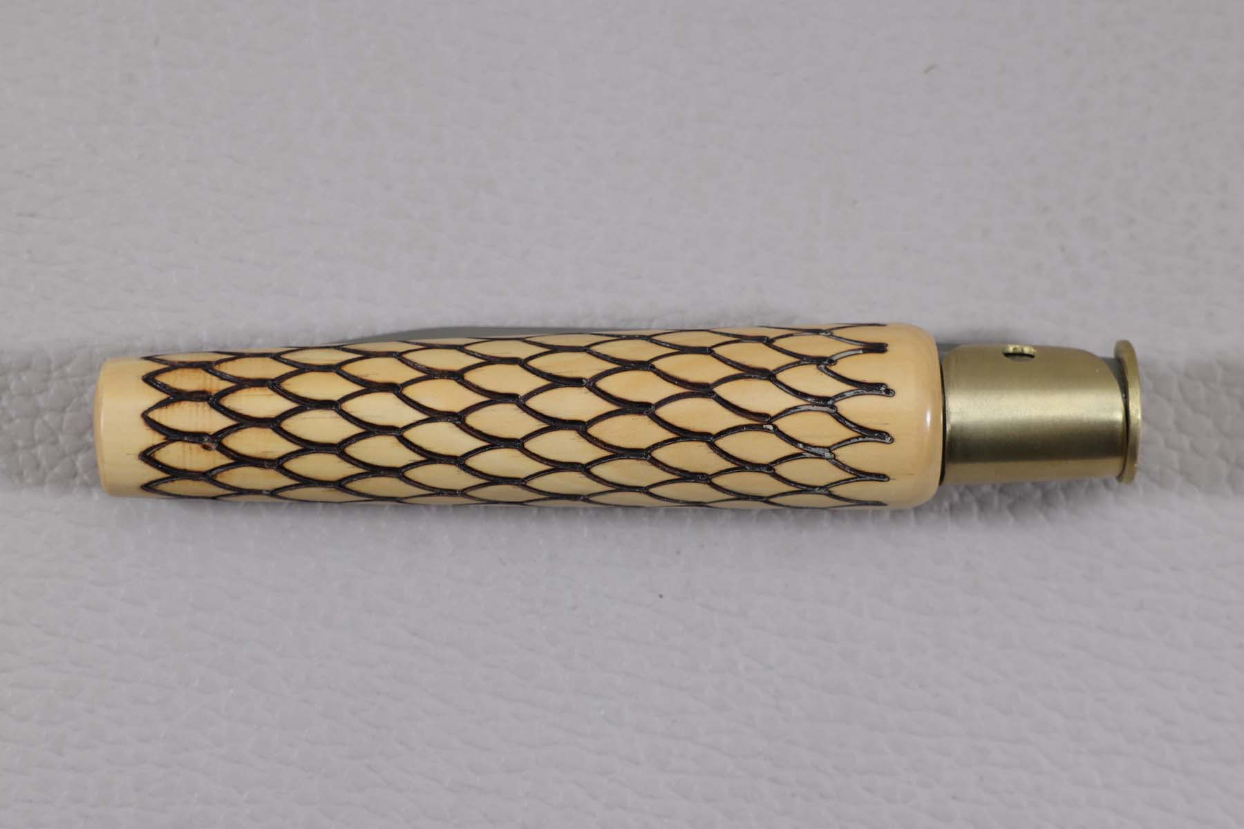 Le manche est en buis, gravé motif plumes et muni d'une virole bloquante.
