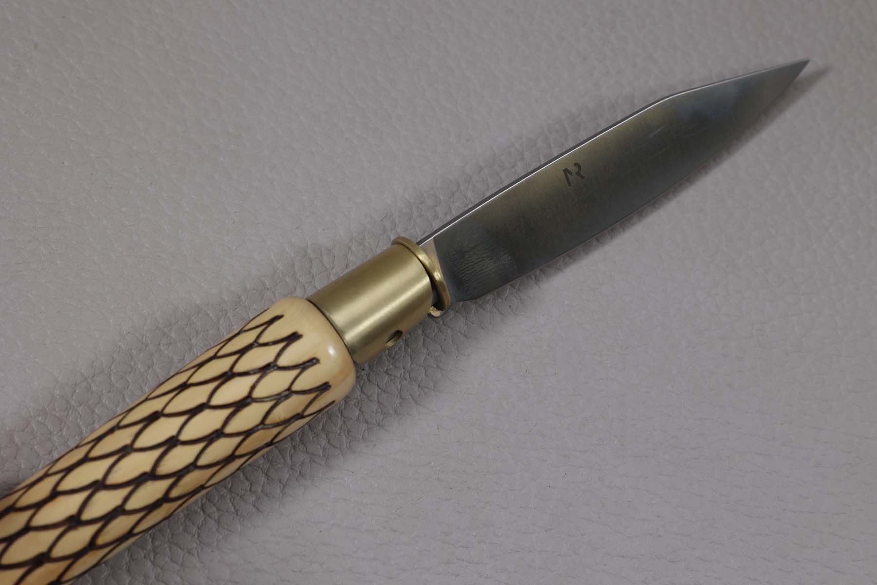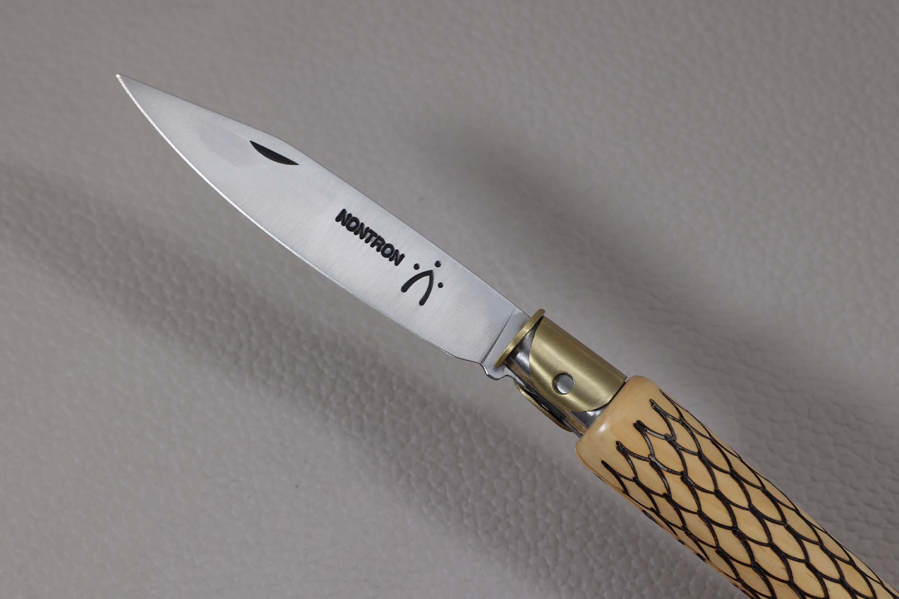 Couteau de poche Nontron N°25 modèle grand-duc en buis avec plumes.