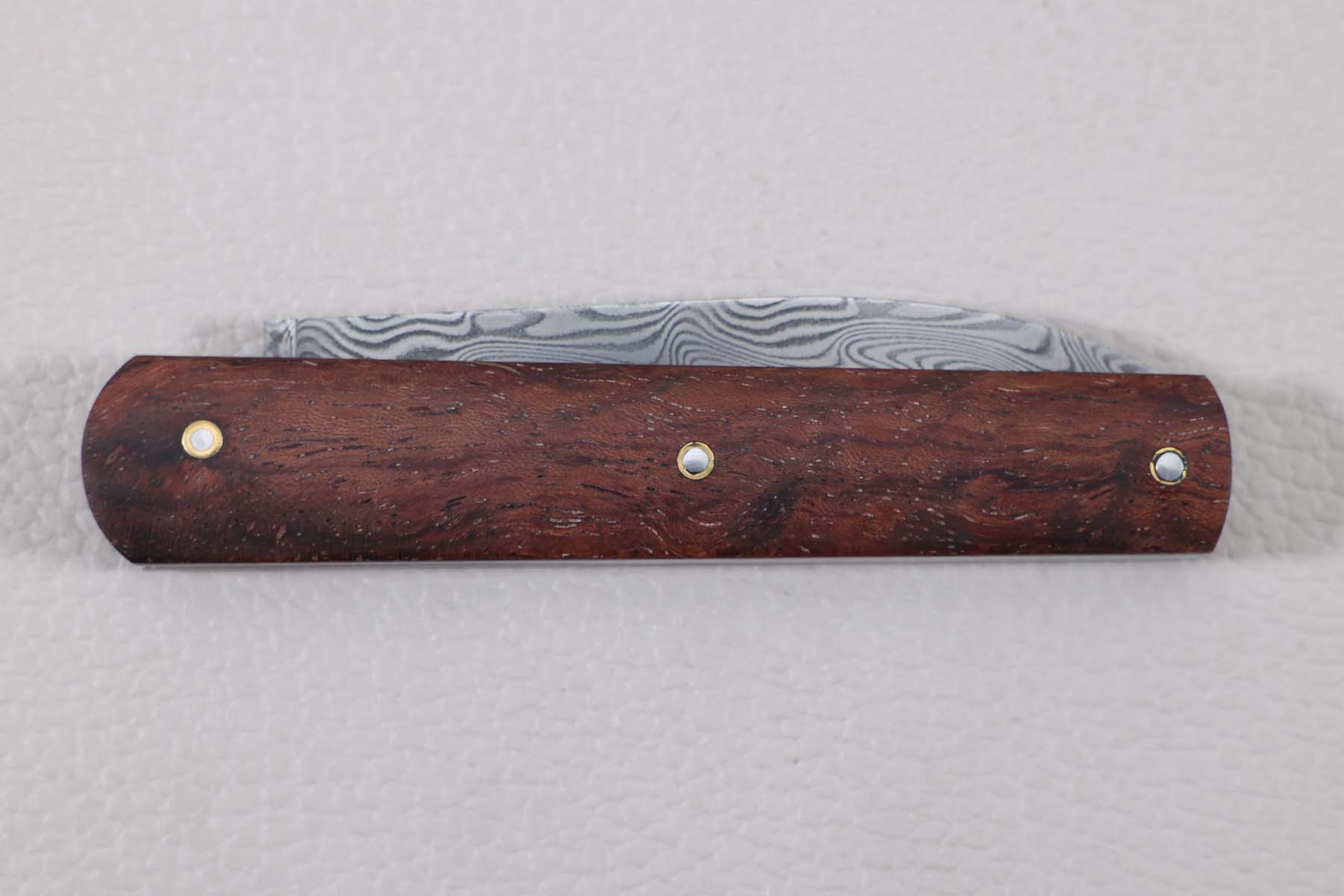 Lame en acier inoxydable Damasteel. Plaquettes en bubinga maintenues par rivets molletonnés sur rosette en laiton lui donnant un style très "Old School".Système cran forcé, fermeture en 2 temps type "Slip Joint".