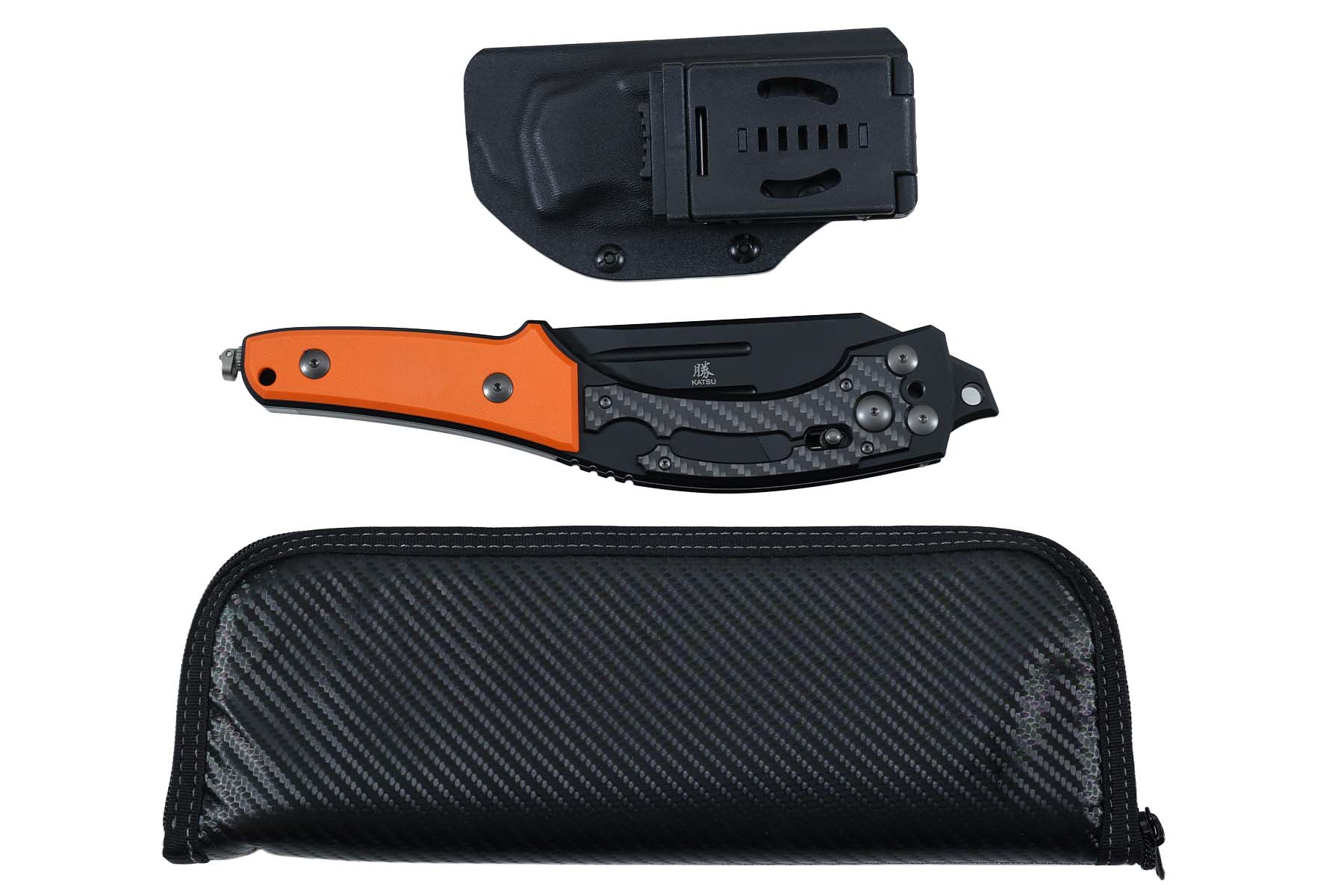 Ce couteau est réalisé avec un manche en G10 orange et fibre de carbone.
